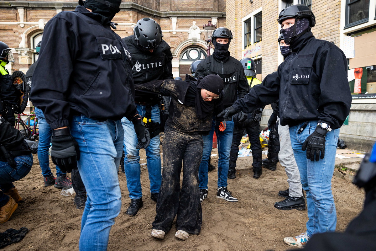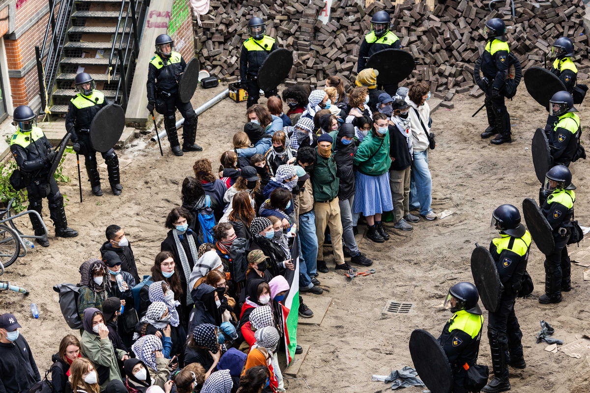 Σε πλάνα που μετέδωσαν ολλανδικά μέσα ενημέρωσης διακρίνονται δεκάδες αστυνομικοί με εξαρτύσεις αντιμετώπισης ταραχών και ρόπαλα να συλλαμβάνουν διαδηλωτές, που έκαναν κατάληψη σε κτίριο του πανεπιστημίου από το βράδυ της Τρίτης.