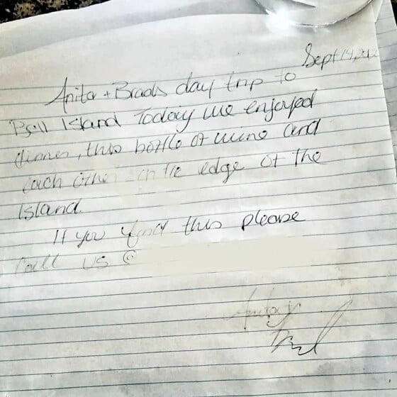 Το γυάλινο μπουκάλι από κρασί με το χειρόγραφο σημείωμα που πετάχτηκε στη θάλασσα πριν από 13 χρόνια από δύο νέους στον Καναδά βρέθηκε πρόσφατα σε παραλία της Ιρλανδίας, σε απόσταση σχεδόν 3.200 χιλιομέτρων. Το μήνυμα, γραμμένο από τον Μπραντ Σκουάιρς και την τότε σύντροφό του Ανίτα Μοράν, περιέγραφε ένα πικνίκ στο νησί Μπελ της Νέας Γης και κατέληγε με την προτροπή: Αν το βρείτε αυτό, καλέστε μας