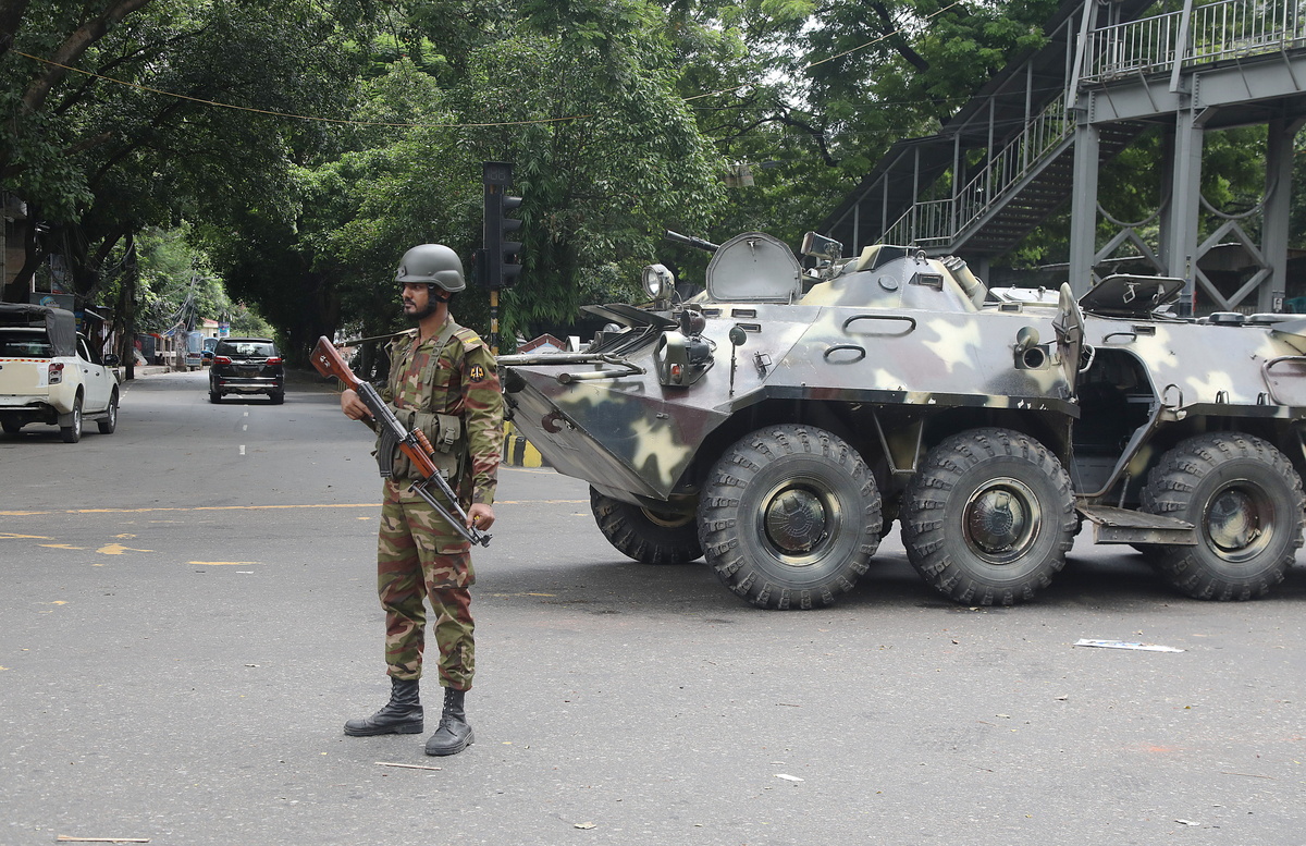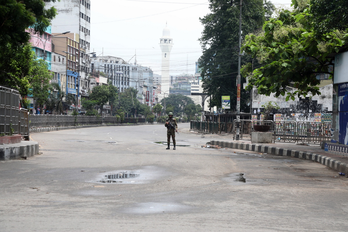 Αρματα μάχης είναι σταθμευμένα σε πολλά σημεία στους δρόμους της πρωτεύουσας Ντάκα, ενώ ένοπλοι άνδρες ασφαλείας που περιπολούν κατευθύνουν τους λιγοστούς αυτοκινητιστές που κυκλοφορούν.
