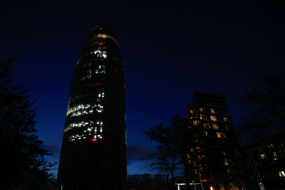 epa12061323 Darkened buildings are seen amid a power outage, in Barcelona, Spain, 28 April 2025. A power blackout hit large parts of Spain and spread to neighbouring Portugal and France, disrupting transport systems, internet connections and daily life, according to authorities. The exact cause of the outage is unknown. EPA/TONI ALBIR