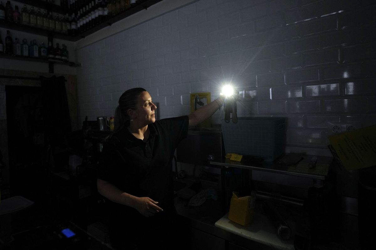 epaselect epa12061257 A woman uses her mobile phone torch inside a store during a power outage, in Madrid, Spain, 28 April 2025. A power blackout hit large parts of Spain and spread to neighbouring Portugal and France, disrupting transport systems, internet connections and daily life, according to authorities. The exact cause of the outage is unknown. EPA/BORJA SANCHEZ-TRILLO