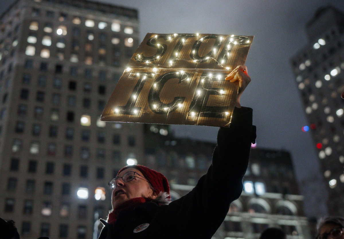 epaselect epa12635421 Protester holds an anti-ICE sign during a rally held in response to an ICE agent in Minneapolis shooting and killing of Renee Nicole Good, in New York, New York, USA, 7 January 2026. EPA/Olga Fedorova