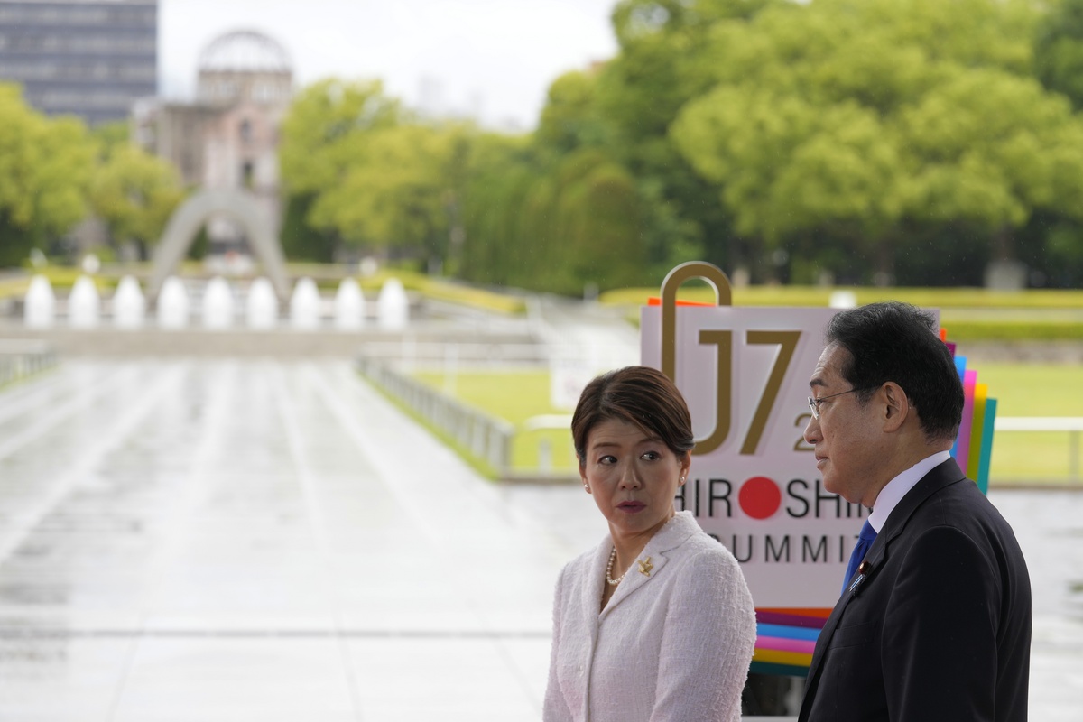 Κάτω από ραγδαία βροχή, τους αρχηγούς κρατών και κυβερνήσεων της Ομάδας των Επτά (G7) περισσότερο ανεπτυγμένων βιομηχανικών χωρών, στην οποία περιλαμβάνονται πυρηνικές δυνάμεις, υποδέχθηκε έναν-έναν ο ιάπωνας πρωθυπουργός Φούμιο Κισίντα στο Πάρκο Ειρήνης της Χιροσίμα.