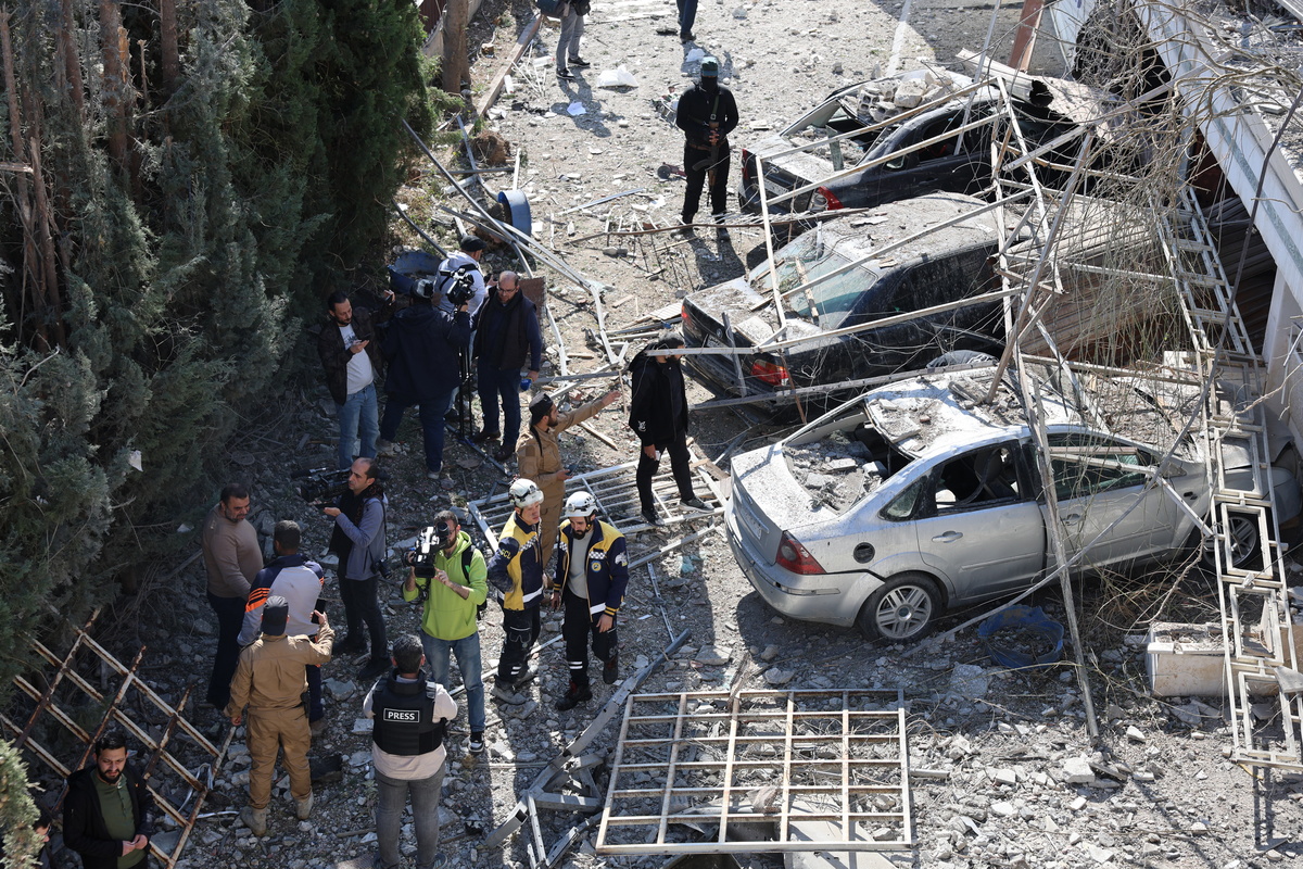 epaselect epa11960781 White Helmets and residents inspect the damage following an Israeli airstrike in the suburbs of Dummar, outskirts of Damascus, Syria, 13 March 2025. Israel confirmed on 13 March its air force had conducted strikes on targets in Damascus, believed to be Palestinian Islamic Jihad command centers. EPA/MOHAMMED AL RIFAI
