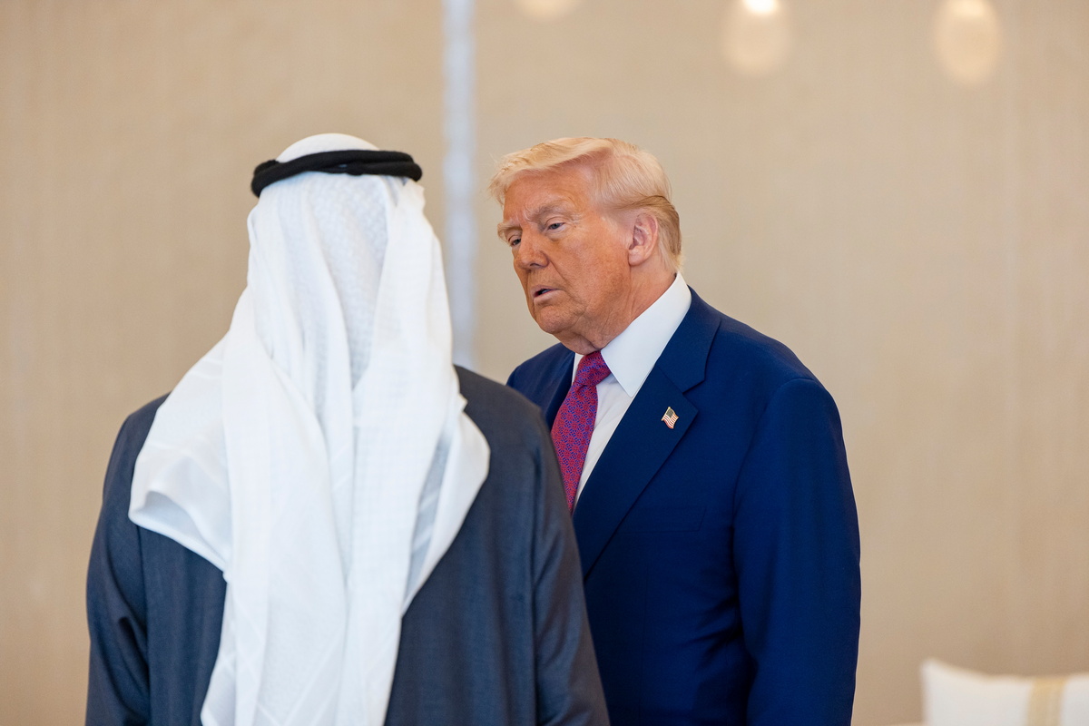 epa12103510 A handout photo made available by the UAE's Presidential Court shows Sheikh Mohamed bin Zayed Al Nahyan (L), President of the United Arab Emirates and Ruler of emirate of Abu Dhabi, and US President Donald Trump (R) stand during a meeting in Abu Dhabi, United Arab Emirates, 15 May 2025. EPA/UAE PRESIDENTIAL COURT / HANDOUT HANDOUT EDITORIAL USE ONLY/NO SALES