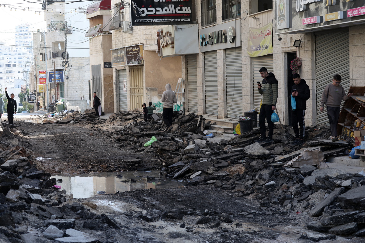 epaselect epa11857918 Palestinians inspect the damage on the second day of an Israeli military raid at Tulkarem refugee camp, near the West Bank city of Tulkarem, 28 January 2025. At least two Palestinians were killed and a dozen injured in the Israeli military raid in Tulkarem and its camp, according to the Palestinian Ministry of Health. EPA/ALAA BADARNEH
