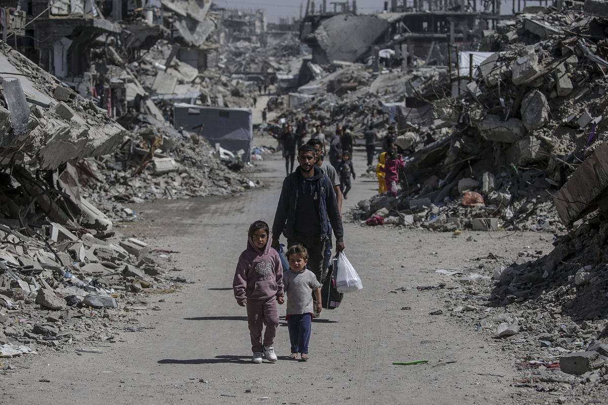 epa12007441 Internally displaced Palestinians walk past the rubble of destroyed buildings in the Jabalia refugee camp, northern Gaza Strip, 03 April 2025, after the Israeli army issued evacuation orders for areas in the northern and eastern Gaza Strip. Israeli forces resumed airstrikes on Gaza on 18 March, ending a ceasefire that had been in place since 19 January. EPA/MOHAMMED SABER