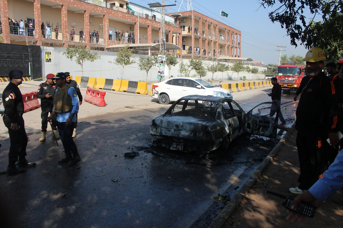 epa12518375 Security officials inspect the scene of a suicide bomb blast outside the judicial complex in Islamabad, Pakistan, 11 November 2025. At least 12 people were killed and dozens injured according to police. EPA/SOHAIL SHAHZAD