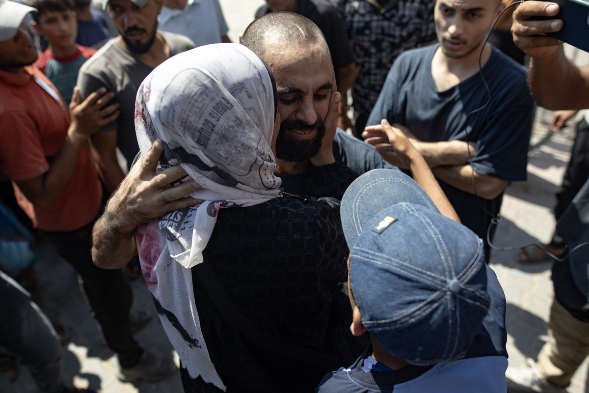 epa11556424 Palestinian man Hob Al-Din Muqat, one of the Palestinian detainees released by Israel, reacts as he meets with his family at Nasser Hospital in Khan Yunis camp, southern Gaza Strip, 20 August 2024. According to the Palestinian news agency Wafa, Israel on 20 August released 25 detainees from the Gaza Strip, including two women, who arrived at the Gaza European Hospital following their release through the Kerem Shalom crossing in the southern Gaza Strip. EPA/HAITHAM IMAD