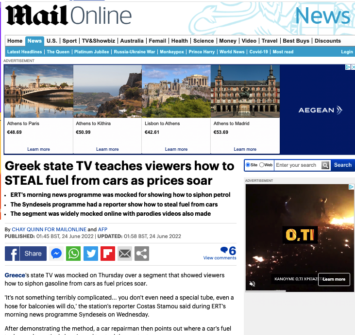 Την είδηση όμως, μετέδωσε και η Dailymail με τον τίτλο «Η ελληνική δημόσια τηλεόραση διδάσκει τους τηλεθεατές πώς να κλέβουν βενζίνη από τα αυτοκίνητα καθώς οι τιμές εκτοξεύτηκαν».