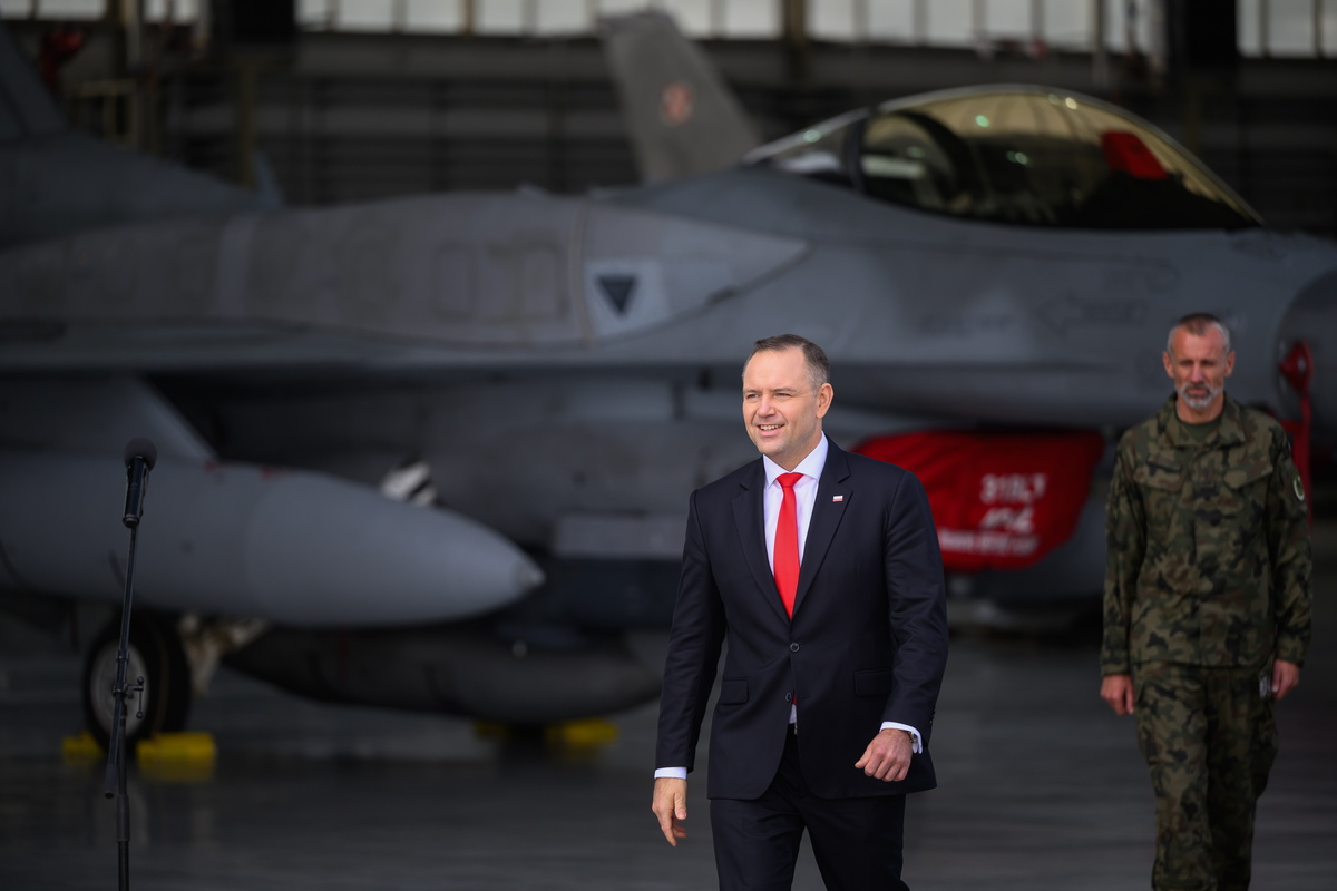 epa12369030 Polish President Karol Nawrocki during a meeting with soldiers at the 31st Tactical Air Base in Poznan-Krzesiny, Poland, 11 September 2025. The president's urgent visit to the Air base in Krzesiny is related to the violation of airspace by Russian drones. EPA/JAKUB KARCZMARCZYK POLAND OUT
