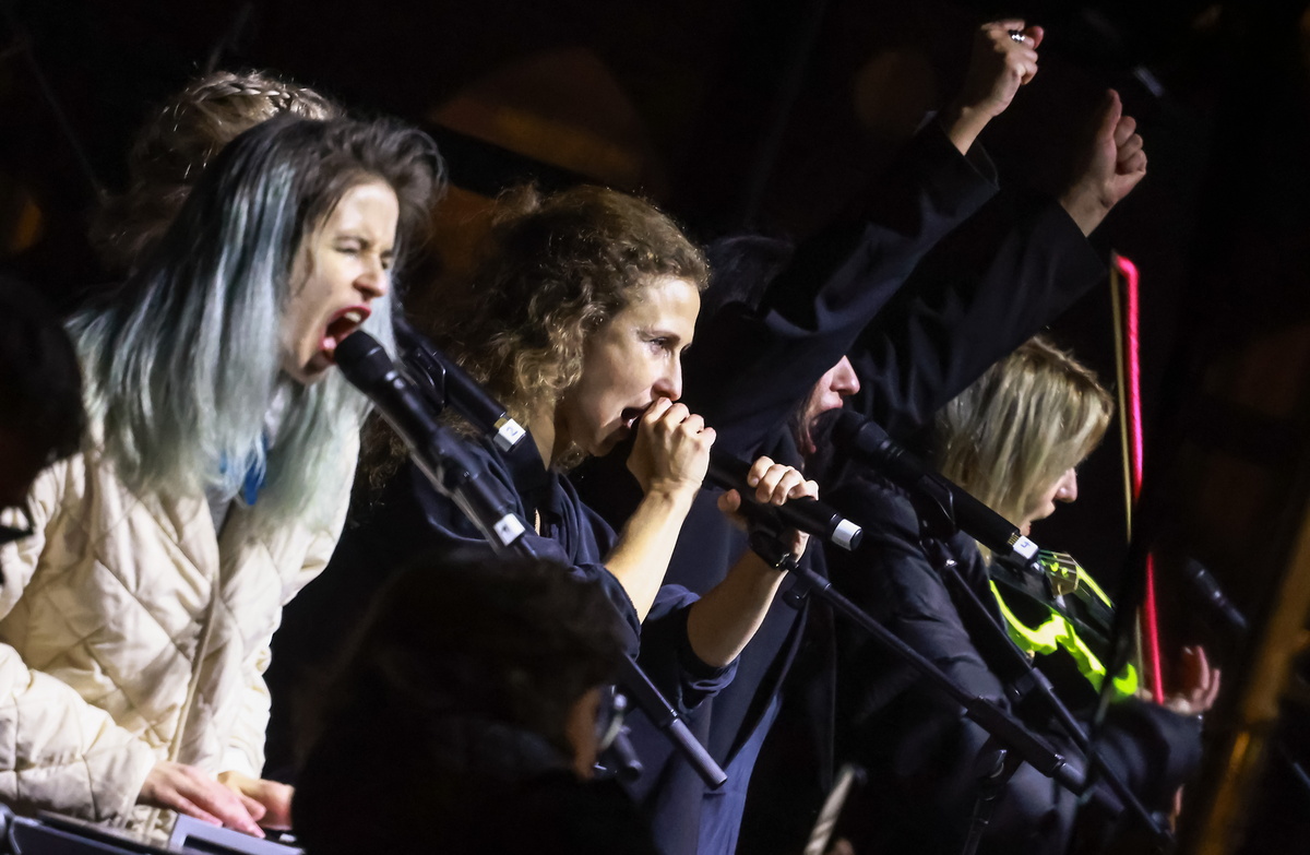 epa11713707 Russian political activists group Pussy Riot performs on stage during the 'Revolution! - and then?' event marking 35 years of the fall of the Berlin Wall at the inner courtyard of the former headquarters of the Ministry for State Security (Stasi), in Berlin, Germany, 10 November 2024. The one-day democracy festival addresses key issues such as the commitment to democracy and human rights, the Peaceful Revolution and the need to acknowledge past injustices in the German Democratic Republic (GDR). EPA/HANNIBAL HANSCHKE