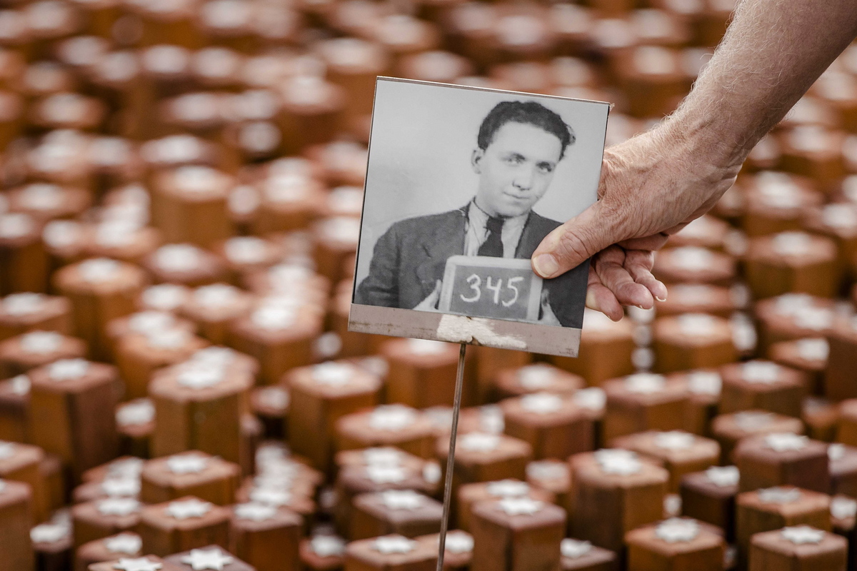 Ένα άτομο τοποθετεί μια φωτογραφία στο μνημείο των 102.000 λίθων, στην επέτειο της πρώτης μεταφοράς από το Άουσβιτς κατά τη διάρκεια του Β’ Παγκοσμίου Πολέμου, στο Westerbrok της Ολλανδίας, 15 Ιουλίου 2022. Η πρώτη μεταφορά από το ναζιστικό στρατόπεδο διέλευσης Camp Westerbrok με 1137 Εβραίους στη ναζιστική Γερμανία και το στρατόπεδο θανάτου Άουσβιτς αναχώρησε τον Ιούλιο του 1942. EPA/SEM VAN DER WAL