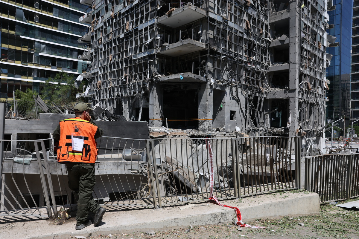 epa12184835 A members of Israel's Home Front Command stands near the site of an Iranian missile strike in a residential area in Ramat Gan, central Israel, 19 June 2025. Israel's military stated Iran launched a barrage of ballistic missiles at Israel overnight. Magen David Adom (MDA), Israel's national emergency services, reported dozens of injured across Israel, with some in critical condition. EPA/ABIR SULTAN