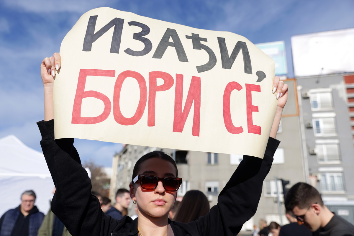 Μια διαδηλώτρια κρατά ένα πανό που γράφει «Βγείτε έξω, Παλέψτε» κατά τη διάρκεια του αποκλεισμού της διασταύρωσης «Autokomanda» στο Βελιγράδι. EPA/ANDREJ CUKIC