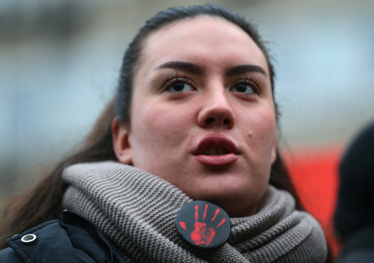 epa11837042 A protestor wearing a badge depicting a bloodied hand takes part in a protest rally in Belgrade, Serbia, 19 January 2025. University students and teachers protested for accountability after the Novi Sad Railway Station canopy collapsed on 01 November 2024, killing fifteen people. The station building, which had been renovated and reopened on 05 July 2024, was undergoing further renovations shortly before the collapse. EPA/ANDREJ CUKIC