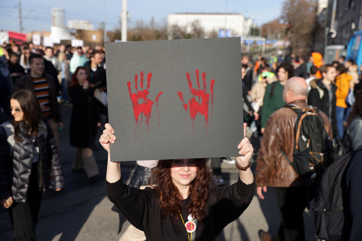 epa11856094 A protester holds up a banner depicting bloodied hands during the blockade of the 'Autokomanda' intersection in Belgrade, Serbia, 27 January 2025. University students staged a protest, demanding accountability after fifteen people lost their lives in the collapse of the Novi Sad Railway Station canopy on 01 November 2024. The station building, which had been renovated and reopened on 05 July 2024, was undergoing further renovations shortly before the collapse. EPA/ANDREJ CUKIC