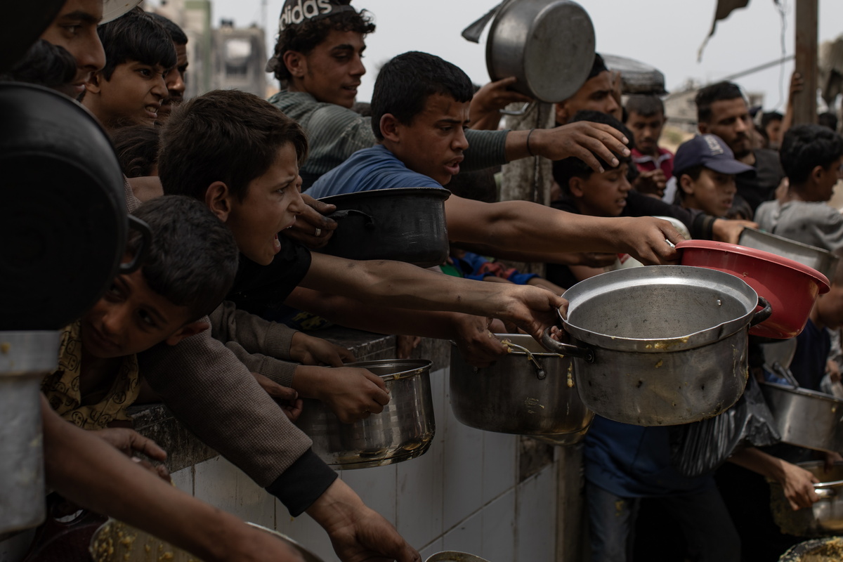 epa12051693 Internally displaced Palestinians push themselves in line to receive a portion of food from a charity kitchen, in Jabalia, northern Gaza Strip, 24 April 2025. According to the UN Palestinian refugee agency UNRWA, over a million people across the Gaza Strip are experiencing 'high levels' of acute food insecurity, with acute malnutrition several times higher than before the war. The UN estimates at least 1.9 million people (nine in ten) are internally displaced. EPA/HAITHAM IMAD