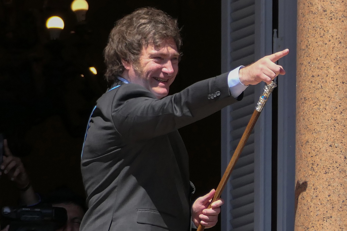 epaselect epa11022101 Argentina's President Javier Milei greets supporters from the balcony of the Casa Rosada in Buenos Aires, Argentina, 10 December 2023. Milei arrived at the Casa Rosada (seat of government) for the first time as head of state of the South American country, after taking the oath of office in Congress and delivering his speech to citizens. The leader of La Libertad Avanza (ultra-right) moved with his sister and main advisor, Karina Milei, in a convertible vehicle to the Plaza de Mayo, where, upon arriving at the Metropolitan Cathedral, he got out of the car and walked among the shouting of his followers. EPA/Enrique Garcia Medina