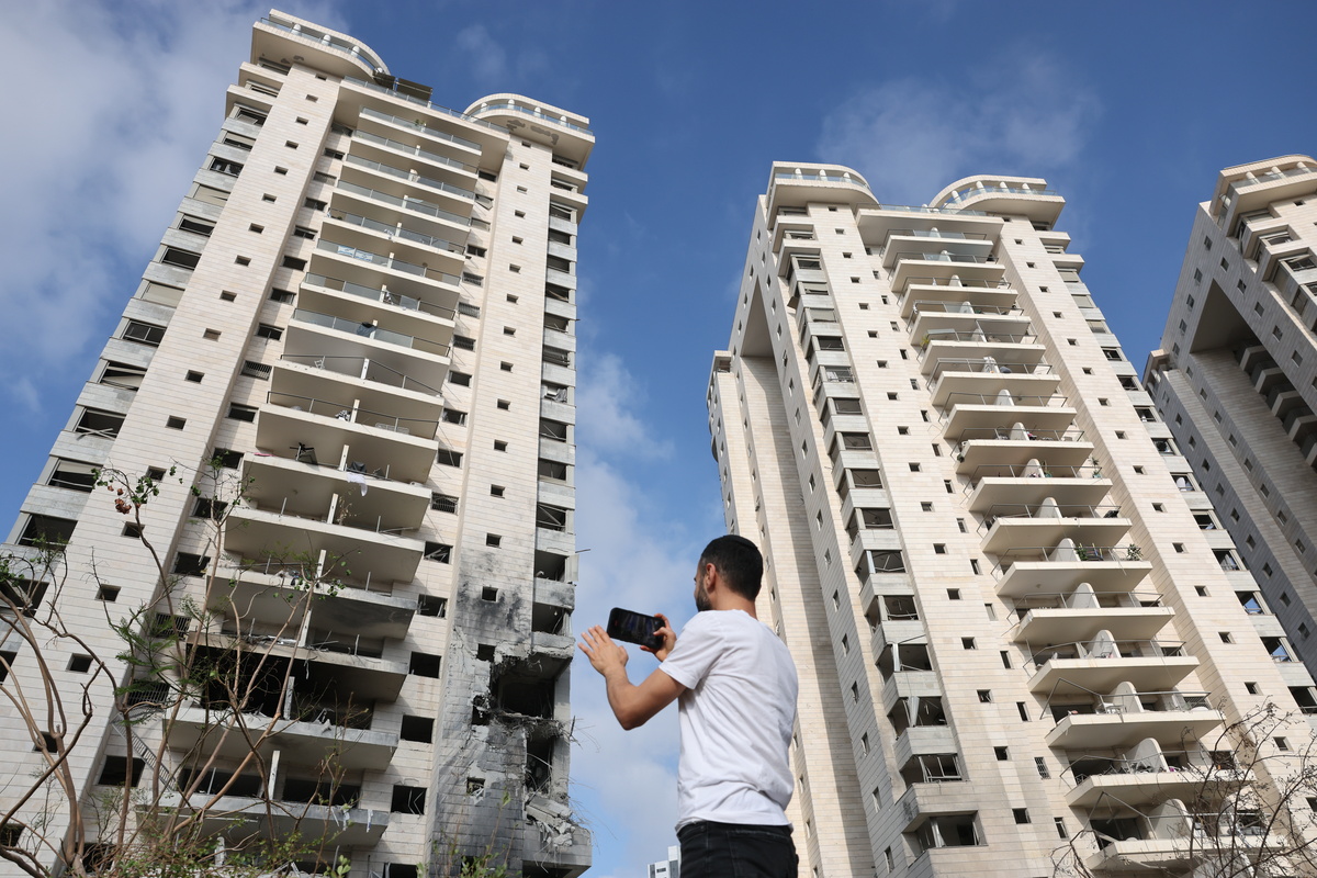 epa12178309 A person takes pictures as Israeli emergency service teams operate at the scene where Iranian ballistic missiles hit residential buildings in Petah Tikva, central Israel, 16 June 2025. Israel and Iran have been exchanging fire since Israel attacked on 13 June 2025 as part of Operation 'Rising Lion.' EPA/ABIR SULTAN