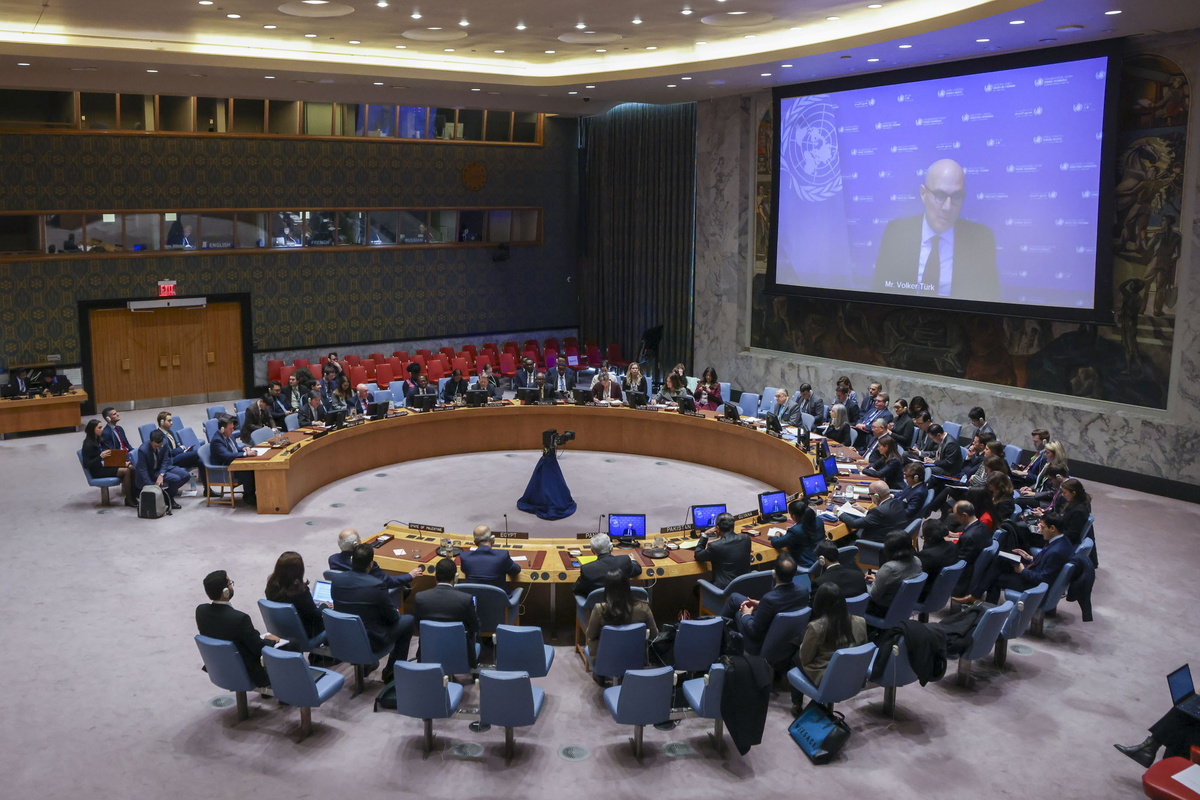 epa11803810 UN High Commissioner for Human Rights Volker Turk speaks via video call during a Security Council meeting at the United Nations headquarters in New York, New York, USA, 03 January 2025. The meeting welcomed new non-permanent members and covered the current situation in Gaza. EPA/SARAH YENESEL