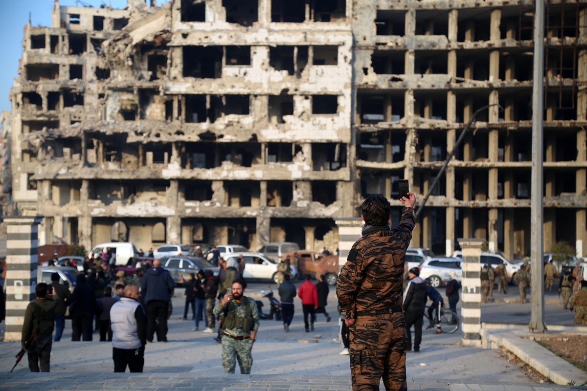 epaselect epa11764070 A rebel (R) takes a selfie as Syrian people and rebels celebrate in the streets of Homs, Syria, 08 December 2024. Syrian rebels entered Damascus on 08 December 2024 and announced in a televised statement the 'Liberation of the city of Damascus and the overthrow of Bashar al-Assad', as well as the release of all the prisoners. The rebels also urged the Syrian armed forces to leave Syrian public institutions, which will stay under the control of the outgoing Syrian prime minister until the official handover ceremony. EPA/BILAL ALHAMMOUD