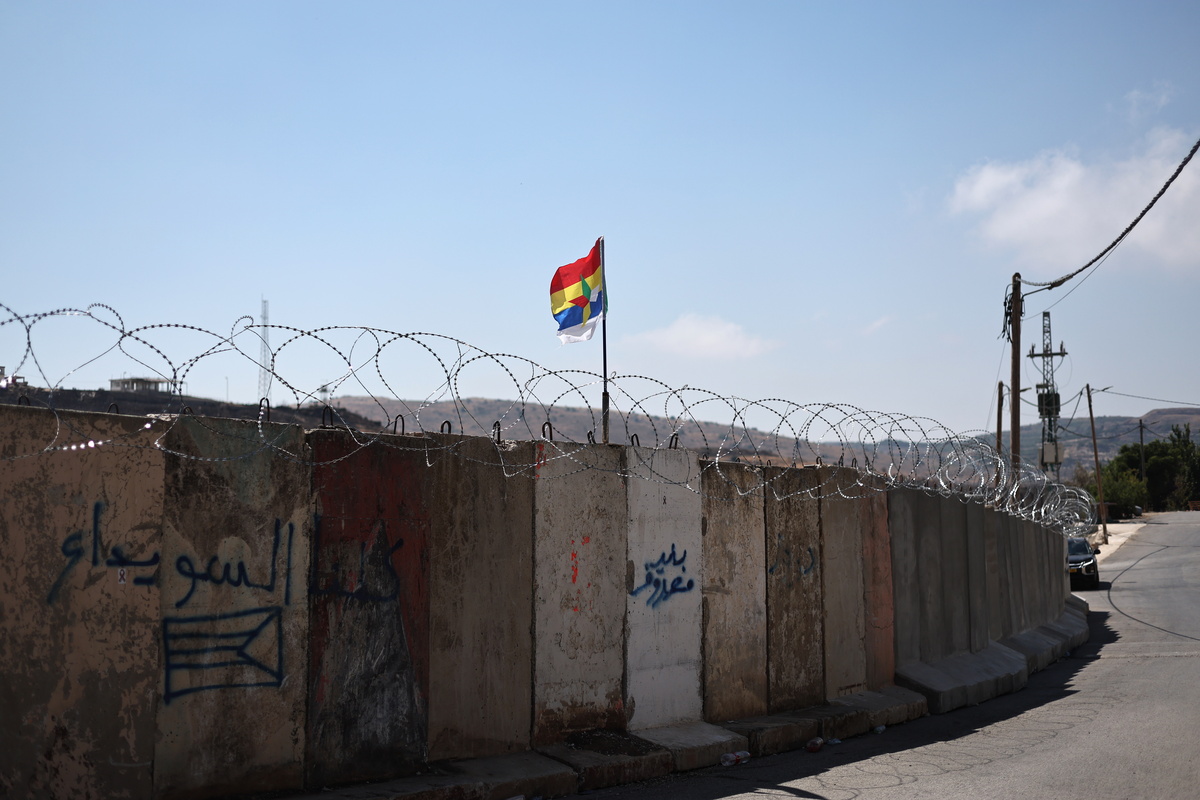 epaselect epa12249218 A Druze flag on a new Israeli concrete wall built next to the gate at the ceasefire line, near the Israeli-annexed Golan Heights village of Majdal Shams, 20 July 2025. EPA/ATEF SAFADI
