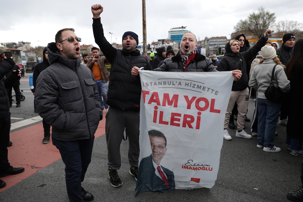 epa11973217 Supporters shout slogans and hold a banner depicting Istanbul Mayor Ekrem Imamoglu as they gather near the Istanbul Police Department following his arrest, in Istanbul, Turkey, 19 March 2025. One day after Imamoglu's university diploma was revoked, Turkish police arrested Istanbul Mayor Ekrem Imamoglu early morning on 19 March along with 100 others as part of an investigation into alleged corruption and terror links, according to a statement by the Istanbul chief public prosecutor. EPA/ERDEM SAHIN