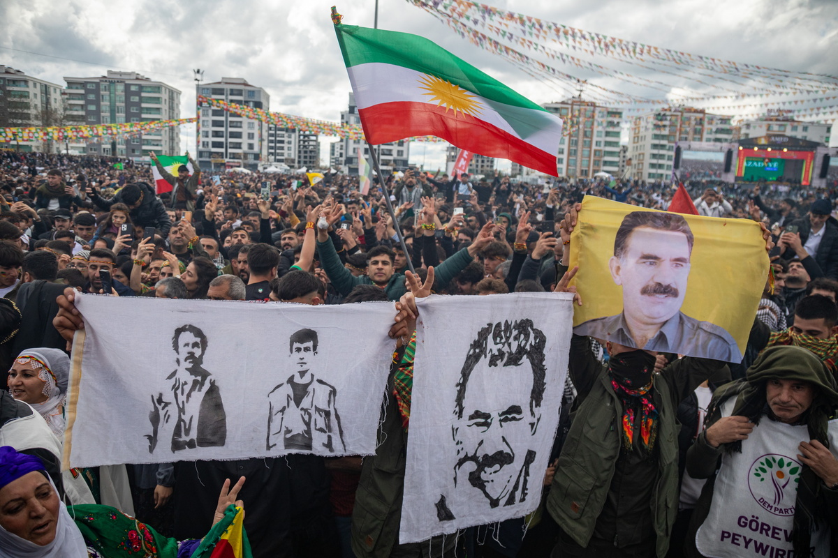 epa11978440 Supporters of The Peoples' Equality and Democracy Party (DEM) hold pictures of Kurdistan Workers' Party (PKK) jailed leader Abdullah Ocalan, and shout slogans next to a bonfire during a rally for Newruz celebrations in Diyarbakir, Turkey, 21 March 2025. Newroz or Nowruz, which means 'new day' in the Persian language, marks the arrival of spring and the first day in the Iranian calendar. It is widely celebrated in the Persian and neighboring regions and recognized on the UNESCO List of the Intangible Cultural Heritage of Humanity. EPA/METIN YOKSU