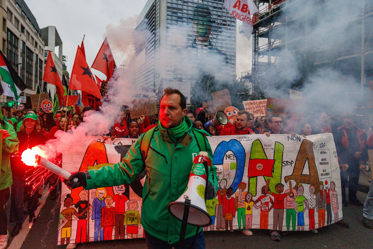 epa12452860 Protesters march during a demonstration called by Belgian trade unions against reform plans of the government in Brussels, Belgium, 14 October 2025. The Belgian main trade unions and civil society organizations called for a national day of action and strike against the so-called 'Arizona government coalition' of Prime Minister Bart De Wever and its austerity plans, which they denounce as 'far-reaching anti-social policies'. EPA/OLIVIER MATTHYS