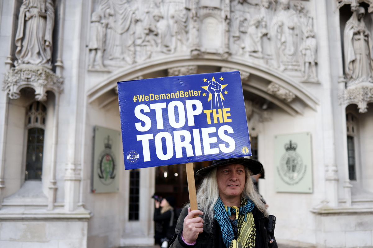 Ένας διαδηλωτής κρατά ένα πλακάτ έξω από το Ανώτατο Δικαστήριο του Ηνωμένου Βασιλείου στο Λονδίνο, Βρετανία, 15 Νοεμβρίου 2023. EPA/NEIL HALL