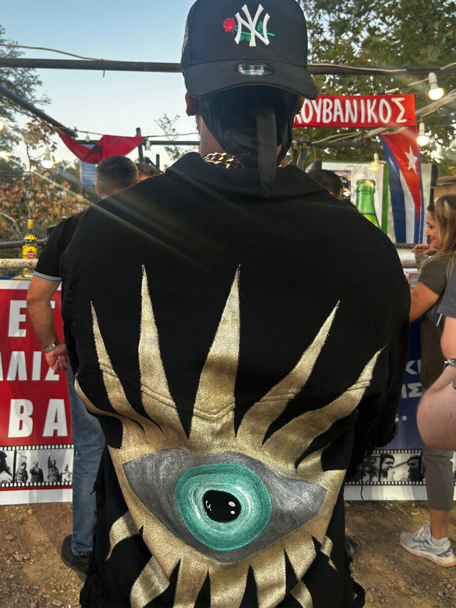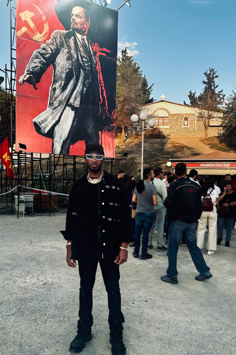 Μια βραδιά πριν τη συνομιλία μας, σε σκηνή του κοσμοπλημμυρισμένου πάρκου Τρίτση, είχε ραπάρει κατά του αφεντικού της Amazon («Fuck Jeff Βezos») και υπέρ της Παλαιστίνης («Viva viva Palestina») ξεσηκώνοντας και τις πέτρες. Τον παρατηρώ όποτε κάποιος πλησιάζει για να τον χαιρετίσει ή να βγάλει φωτογραφία μαζί του. Είναι προσηνής. Φορά μεταλλικά ασημί γυαλιά, χοντρές επώνυμες αλυσίδες στο λαιμό κι ένα πανωφόρι γεμάτο μεγάλα μπλε μάτια.