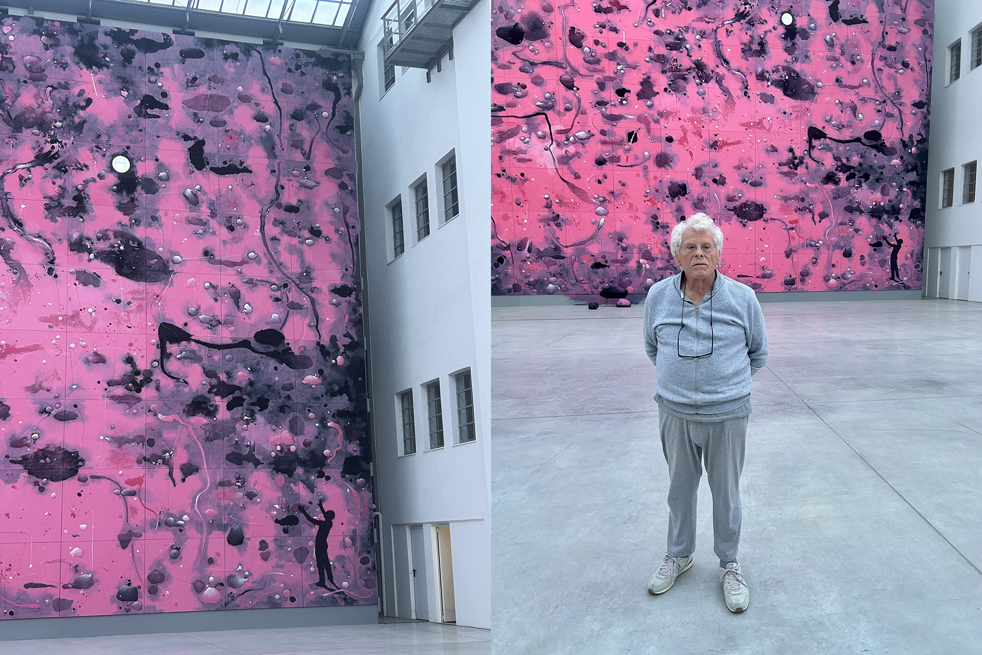 Θεατές και ο ίδιος ο καλλιτέχνης μπροστά από το εκκωφαντικά ροζ έργο-μαμούθ που δημιούργησε.
