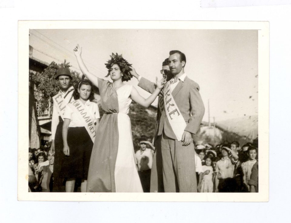 «Ο μπάρμπα-Θόδωρος, που έφαγε τρεις σφαίρες και επέζησε. Ως ΚΚΕ, στεφανώνει την κοπέλα του συμβολίζει την Ελλάδα στη γιορτή, στις 27-9-1944, για τα τρία χρόνια από την ίδρυση του ΕΑΜ. Βλέπεις λοιπόν αυτό που λέγαμε. Οι Γερμανοί αποχώρησαν δύο εβδομάδες μετά και μόλις 3 χλμ από το κέντρο της Αθήνας, στην πλατεία της Καισαριανής, ο ΕΛΑΣ έκανε παρελάσεις σε μια ελεύθερη συνοικία.» Πηγή: Γενικά Αρχεία του Κράτους, φωτ. Βασίλης Τσακιράκης
