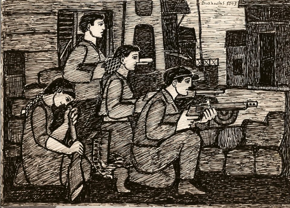 Πίνακας του Καισαριανιώτη ζωγράφου Γιώργου Σικελιώτη με τίτλο «Στα οδοφράγματα», που απεικονίζει αγόρια και κορίτσια του ΕΛΑΣ να πολεμούν, πιθανότατα στην Καισαριανή. Πηγή: Συλλογή Φωτίκας Σικελιώτη-Χατζή