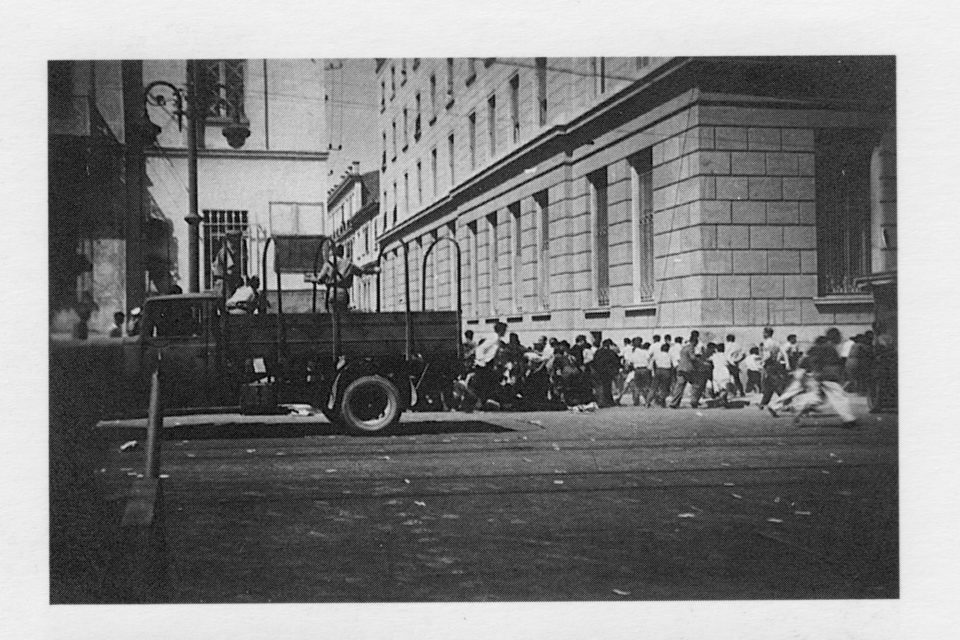 Η στιγμή που Γερμανός βάλλει με πυροβόλο από την καρότσα του φορτηγού, κατά των διαδηλωτών στη συμβολή των οδών Πανεπιστημίου και Ομήρου, έξω από την Τράπεζα της Ελλάδος, κατά τη διάρκεια αντιστασιακής διαδήλωσης στις 22-7-1943. Την ημέρα εκείνη σκοτώθηκαν τουλάχιστον 13 άοπλοι διαδηλωτές και τραυματίστηκαν περίπου 70. Πηγή: Κων/νος Μπίρης, Αι Αθήναι, Αθήνα, Μέλισσα 2005.