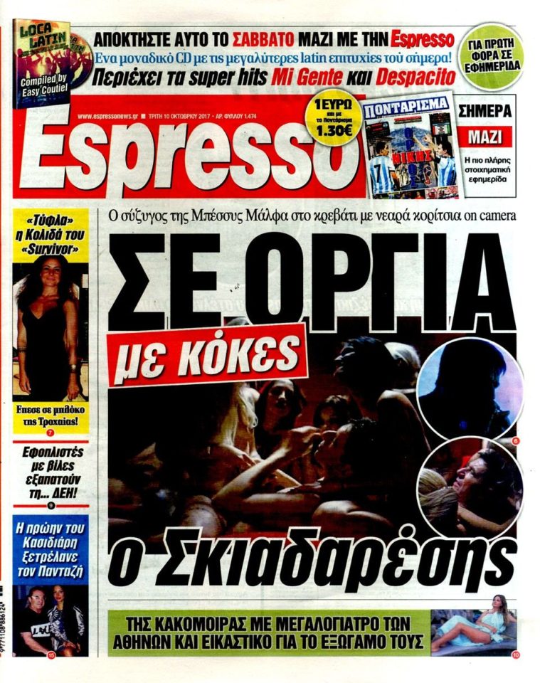 Κοιτάξτε το παρακάτω πρωτοσέλιδο και πείτε μας τι καταλαβαίνετε; Ο Σκιαδαρέσης με κορίτισια, κόκα, on camera και η Μπέσσυ Μάλφα τι κάνει; Κοιμάται τον ύπνο του δικαίου; Εντάξει μέσα στο ρεπορτάζ θ´ αναφέρονται όλα αυτά αλλά στο εξώφυλλο γίνονται γαργάρα για να πουλήσουμε. Η δημοσιογραφία στα χειρότερά της και το πρόβλημα είναι ότι κανείς δεν ενδιαφέρεται. Εδώ κυριακάτικη εφημερίδα έφραφε πως με το που γίνουν δεκαπέντε χρονών τα ελληνόπουλα θ’ αλλάζουν αυτόματα φύλο, εδώ θα κολλήσουμε;
