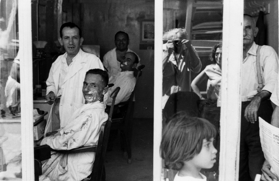 Ο κύριος που φορούσε μαύρο μπλουζάκι και παντελόνι στις προηγούμενες φωτό (στο μανάβικο και στην άλλη με το γαϊδουράκι) αφήνεται στις περιποιήσεις μιας κυρίας που αποτελούσαν την συντροφιά της Μελίνας Μερκούρη σ΄αυτή την άγνωστη εξόρμηση. Στη φανέλα του ναύτη διακρίνονται τα γράμματα ΜΑΙΑ (Μάγια;) II.