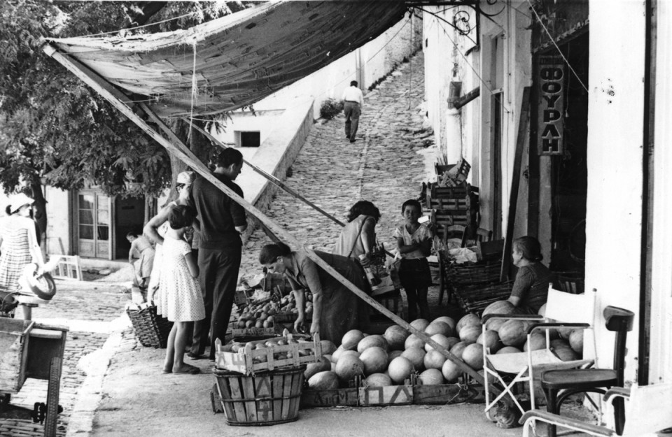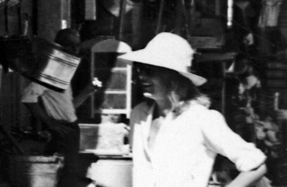Το τσαντάκι (στην αρχική φωτό το έχει ακουμπήσει στο τραπεζάκι του καφενείου), τα μαύρα γυαλιά που διακρίνονται – και μάλλον τα δαγκώνει ελαφρά – (αριστερά στο κάδρο) και η κίνηση του σώματος επιβεβαιώνουν ότι πρόκειται για την Μελίνα Μερκούρη. Και μάλλον είναι στην παλιά πόλη της Καβάλας, στην ανηφόρα για το Ιμαρέτ (Παναγιά). Ο φωτογράφος αυτής της παρέας (και αυτής της σκηνής) δεν μπορεί να είναι άλλος από τον Ντασέν με σκεπτικό «ρεπεράζ» και σύμφωνα με τις πληροφορίες του (ηθοποιού) Λευτέρη Λαμπράκη, μάλλον για το Τοπ Καπί.