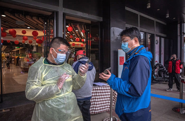 Υπάλληλος με προστατευτική στολή τσεκάρει τον υγειονομικό κωδικό ένος πελάτη έξω από εμπορικό κέντρο στη Γουχάν της Κίνας -Roman Pilipey/EPA-EFE