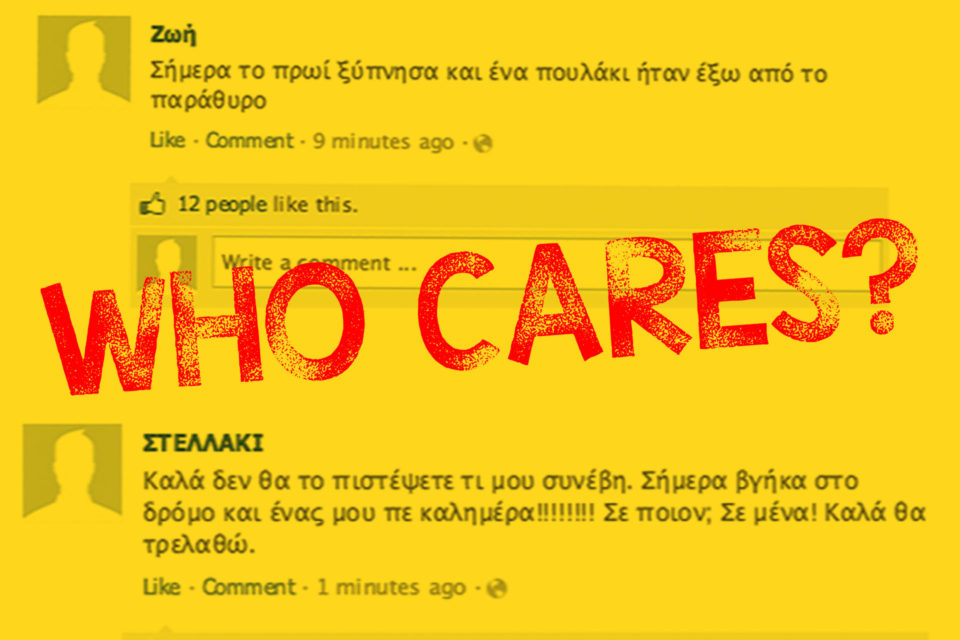 Είναι φορές που κι εγώ η ίδια έχω αναρωτηθεί πώς ένας άνθρωπος που όλη μέρα τρέχει σε δουλειές και πήζει το πράμα του βρίσκει χρόνο να κάνει δέκα αναρτήσεις με όσα του συμβαίνουν κάθε ώρα και στιγμή. Γυναίκες με γατιά, σκυλιά, παιδιά και δουλειά μιλούν για τα κουλουράκια που έκαψαν, για τα ρούχα που χάλασαν στο πλύσιμο, για το αμάξι που βγάζει καπνούς και δεν ξέρουν γιατί ή για το φρύδι που βγήκε στραβά. Άντρες με επαγγελματική απασχόληση 10 ωρών και πάνω, γράφουν για τα χιλιόμετρα που έκαψαν στο διάδρομο του γυμναστηρίου, για τον πυρετό που δεν λέει να πέσει και τώρα το γύρισε σε συνάχι και έχουν τελειώσει τα χαρτομάντιλα, για την τρίχα από το μούσι που φύτρωσε στριφτά και δημιούργησε πόρο με πύον, για το σουβλάκι που τους έφερε καούρα. Κι εμείς διαβάζουμε και άλλες φορές συμπονούμε άλλες γελάμε άλλες σιχτιρίζουμε.