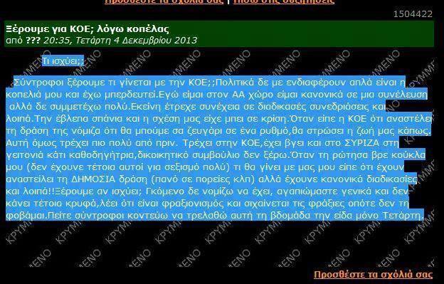 Με αφορμή την παραπάνω ατάκα ο Δημήτρης μου αφηγείται μια διασκεδαστική ιστορία. «Καλοκαιρινές διακοπές στο υπέροχο κυκλαδονήσι. Πίνουμε, τρώμε στην ταβέρνα. Ωραίο κλίμα, πολύ ωραία κορίτσια στο διπλανό τραπέζι, κέφι, τραγούδι, ερχόμαστε κοντά, φίλος φλερτάρει έντονα κοπέλα της άλλης παρέας, γυμνάστρια, σέξι, τούμπανο, εκείνη ανταποκρίνεται, περνάει η ώρα, φεύγουμε, πάμε ντίσκο, εμείς μεθάμε κι άλλο, εκείνοι φεύγουν μαζί και συνεχίζουν περπατώντας στα στενά, έχει σχεδόν ξημερώσει, φιλιά, ρομαντζάδα, αράζουν να δουν την ανατολή, εκεί απέναντι υπάρχει τοίχος με πολιτικό σύνθημα, το κλασικό ΚΚΕ με κόκκινη μπογιά, κάτι σχολιάζει αυτή, κάτι απαντά αυτός, ανάβει η κουβέντα, αν είναι δυνατόν σχεδόν 7 το πρωί με το σεξ να έχει σερβιριστεί, η τύπισσα του λέει κάτι σε στυλ “εντάξει, σε μερικά δεν έχει κι άδικο η Χρυσή Αυγή”, κι ο δικός μας γίνεται ιδεολογικός καληνυχτάκιας χωρίς δεύτερη σκέψη. Εκείνη δε μάθαμε ποτέ τι ψήφισε στις επόμενες εκλογές».