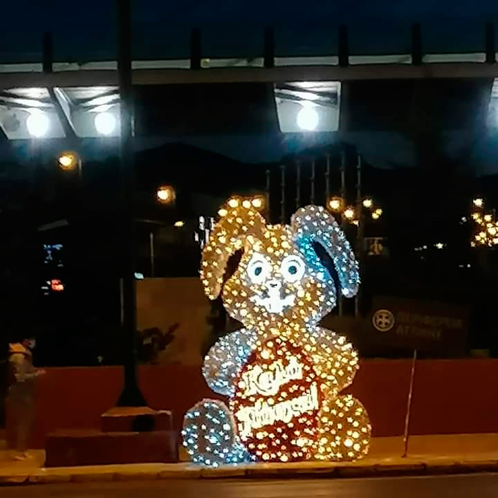 Ξαναγυρίζω στην Κατεχάκη, ώρα ντάλα μεσημέρι (εδώ είναι και ο αγαπημένος μου λαγός). Περιμένω στη σειρά. Μπροστά μου μία κυρία κοιτά υπομονετικά έναν κύριο που νομίζει πως αυτοφωτογραφίζεται για τη Vogue (πασχαλινή έκδοση). Βάλε και ένα εμένα, τρεις που παλιμπαιδίζουν ντάλα μεσημέρι, μέσα στην πόλη, μπροστά σε ένα out of space huge bunny (έτσι για να μιλήσω και στη γλώσσα του). Θα βγάλω ευθύς, αυθαίρετο συμπέρασμα πως το creepiness στον λαγό, το εκτιμά περισσότερο ο αντρικός πληθυσμός. Και το φωταγωγημένο ακόμη περισσότερο. Κάθε βράδυ τα bunnies βλέπεις, παθαίνουν γιορτή και λάμπουν σαν Χριστουγεννιάτικο. Θα περάσω και τότε. Πριν τις 9 φυσικά.