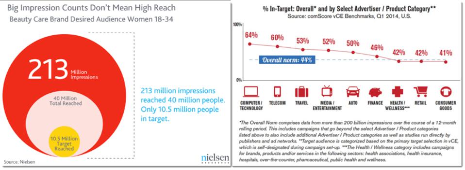 «Ας πάρουμε μια άλλη πτυχή, αν οι ψηφιακές διαφημίσεις εμφανίζονται στο σωστό κοινό-στόχο. Οι περισσότεροι marketers υποθέτουν ότι όταν καθορίζουν το κοινό-στόχο τους (π.χ. αγοράζοντας τμήματα δεδομένων από προμηθευτές τεχνολογίας διαφημίσεων) ότι οι διαφημίσεις τους στοχεύουν σωστά στο 100% των περιπτώσεων. Η αλήθεια είναι μακριά από αυτό. Δεδομένα από τη Nielsen και comScore, από το 2011 και 2014 αντίστοιχα, έδειξαν ότι οι διαφημίσεις που πετυχαίνουν τον στόχο τους κυμαίνονται από 5% (αριστερό γράφημα 10 εκατομμύρια από 213 εκατομμύρια) έως 50% (δεξί γράφημα – 44% κατά μέσο όρο «εντός στόχου»). Αυτό σημαίνει ότι το πολύ, μόνο οι μισές διαφημίσεις εμφανίστηκαν πραγματικά στο σωστό κοινό όταν χρησιμοποιήθηκαν μέθοδοι targeting».