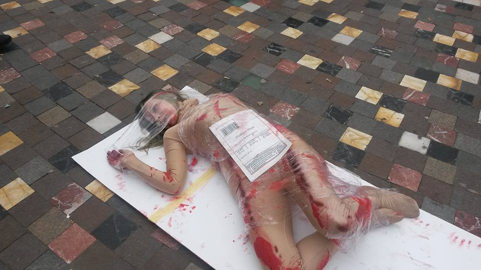 Στοχεύουμε στο να κάνουμε πράγματα που ο άνθρωπος δεν έχει συνηθίσει να βλέπει. Έχουμε κάνει αναπαράσταση το ψάρεμα, όπου τρυπήσαμε το χείλος της Μαρίνας με αγκίστρι στην ψαραγορά στη Βαρβάκειο. Ήταν η πρώτη μας πιο extreme δράση. Την Παγκόσμια Ημέρα κατά της Γούνας είχαμε κάνει πασαρέλα με ματωμένες -ψεύτικες- γούνες, όπου ο εκτροφέας διαφήμιζε αυτά που πουλούσε με παραστατική και σκληρή γλώσσα, ως προς τον τρόπο που είχε φτιαχτεί η γούνα που φορούσαν τα μοντέλα. Κάναμε και live skinning, κοινώς ξεπέτσιασμα, όπου «γδέρναμε» ένα από τα μέλη του κινήματος, με προσθετικά βέβαια επάνω. Είχαμε δημιουργήσει δύο επίπεδα με προσθετικό δέρμα και σωληνάκια με κόκκινο χυμό και η όλη διαδικασία έγινε επί τόπου, με ήχους από ζώα που ούρλιαζαν ενώ γδέρνονταν ζωντανά. Υπήρχαν κάποιοι που τους έλειπαν κομμάτια απ’ το πρόσωπο και ήταν τα μάτια έξω. Ήταν αρκετά σοκαριστικό.