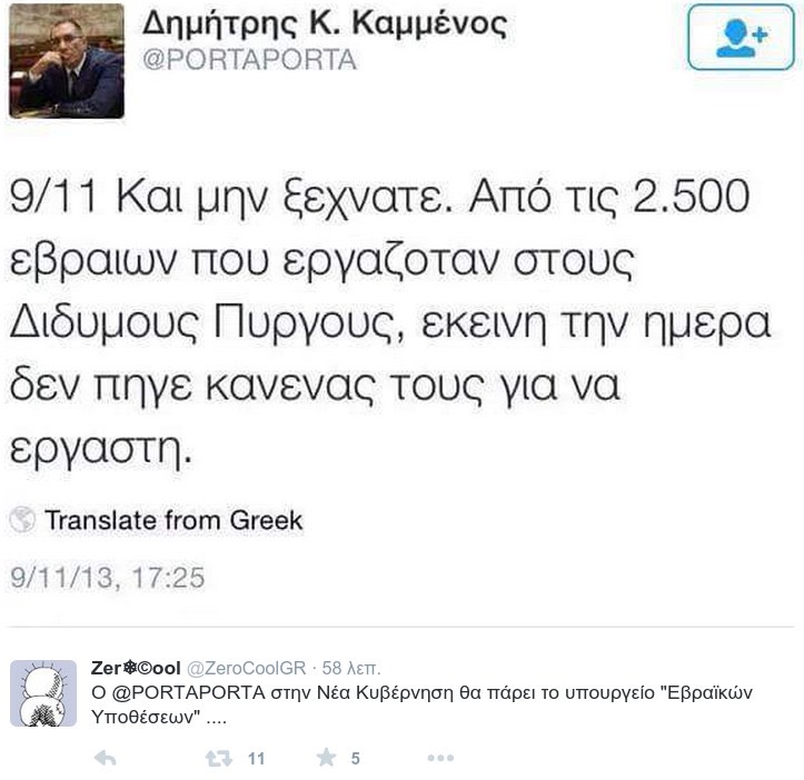 Όταν ο Δημήτρης Καμμένος (τρομερό τέχνασμα του Πάνου να κατεβάζει συνεπώνυμούς του υποψήφιους) ξεσκέπαζε την εβραϊκή συνωμοσία της 11ης Σεπτεμβρίου το 2013 που να φανταζόταν ότι δύο χρόνια μετά αυτό το tweet θα έβαζε πρόωρο τέλος στην υπουργική του καριέρα (…που κράτησε μόλις 12 ώρες).