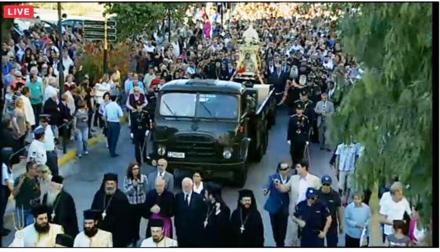 Αρχές Μάη του ’15 με τον ΣΥΡΙΖΑ στα αριστερά ντουζένια του ακόμα, αφού δεν έχει υπογράψει μνημόνιο, κι αμέσως μετά το Άγιο Φως ένας ακόμα αρχηγός κράτους έρχεται στην Ελλάδα. Αυτή τη φορά λέγεται «σκήνωμα της Αγίας Βαρβάρας». Ο Πάνος δίνει ρεσιτάλ με την υποδοχή με στρατηγούς, ναυάρχους και μητροπολίτες, ενώ η Αγία μεταφέρεται με κιλλίβαντα πυροβόλου.