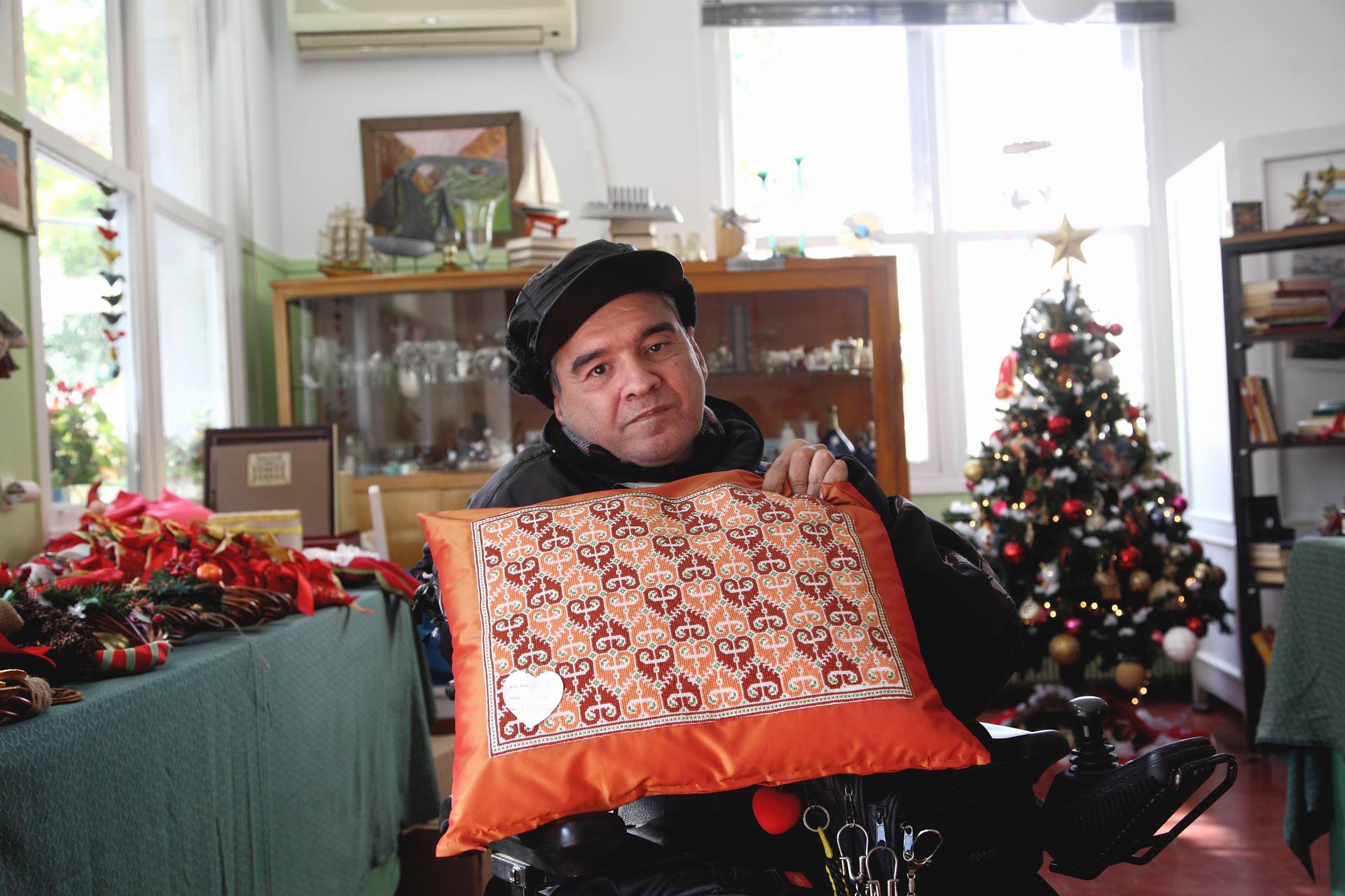 Παρότι εκ γενετής μπορεί να κινήσει μόνο το αριστερό του χέρι, εκείνος κάθεται με τις ώρες στο καροτσάκι που έχει στολίσει με μια αφίσα της φετινής κυπελλούχου ΑΕΚ και παλεύει με τις βελόνες. Αυτή είναι η δουλειά του όπως λέει ενώ παράλληλα με οδηγεί μέχρι το σημείο όπου βρίσκεται το εργόχειρο που ολοκλήρωσε έπειτα από δύο μήνες προσπάθειας. «Αυτό που μου δίνει κουράγιο να συνεχίσω είναι η δύναμη που έχουν. Οι άνθρωποι που είναι εδώ έχουν συνειδητοποιήσει τα προβλήματα υγείας τους και απολαμβάνουν με ένα μεγαλείο ψυχής τις μικρές χαρές που τους δίνονται», καταλήγει η πρόεδρος του σωματείου ενώ μετά από λίγη ώρα ο Βαγγέλης ποζάρει στον φακό κρατώντας το κεντημένο μαξιλάρι που δημιούργησε.