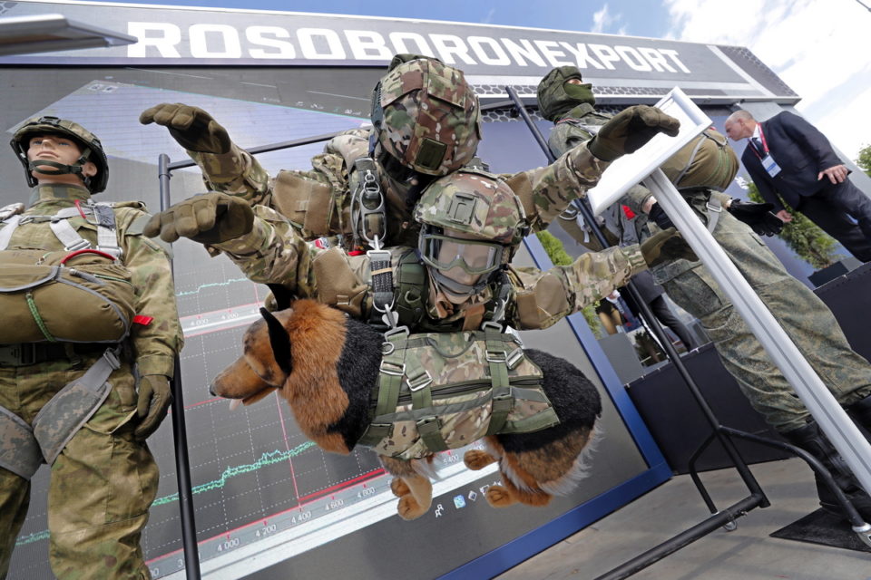 Ρωσικό σύστημα αλεξίπτωτου “Athlete-370” με ιμάντα αλεξίπτωτου για σκύλους, στο περίπτερο της ρωσικής κρατικής εταιρείας Rosoboronexport.