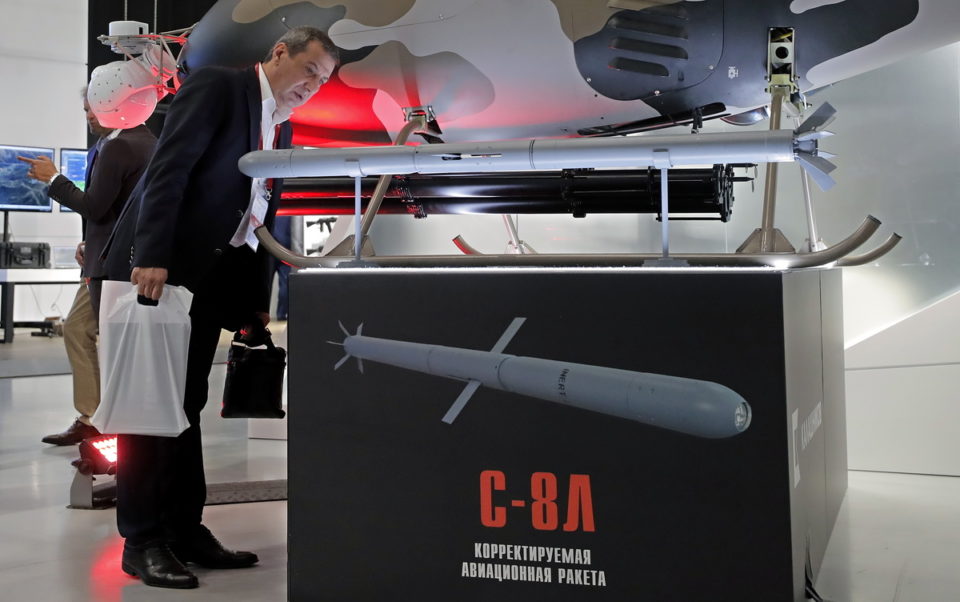 Ένας επισκέπτης εξετάζει έναν νέο πύραυλο διόρθωσης στο περίπτερο του ομίλου Καλάσνικοφ.